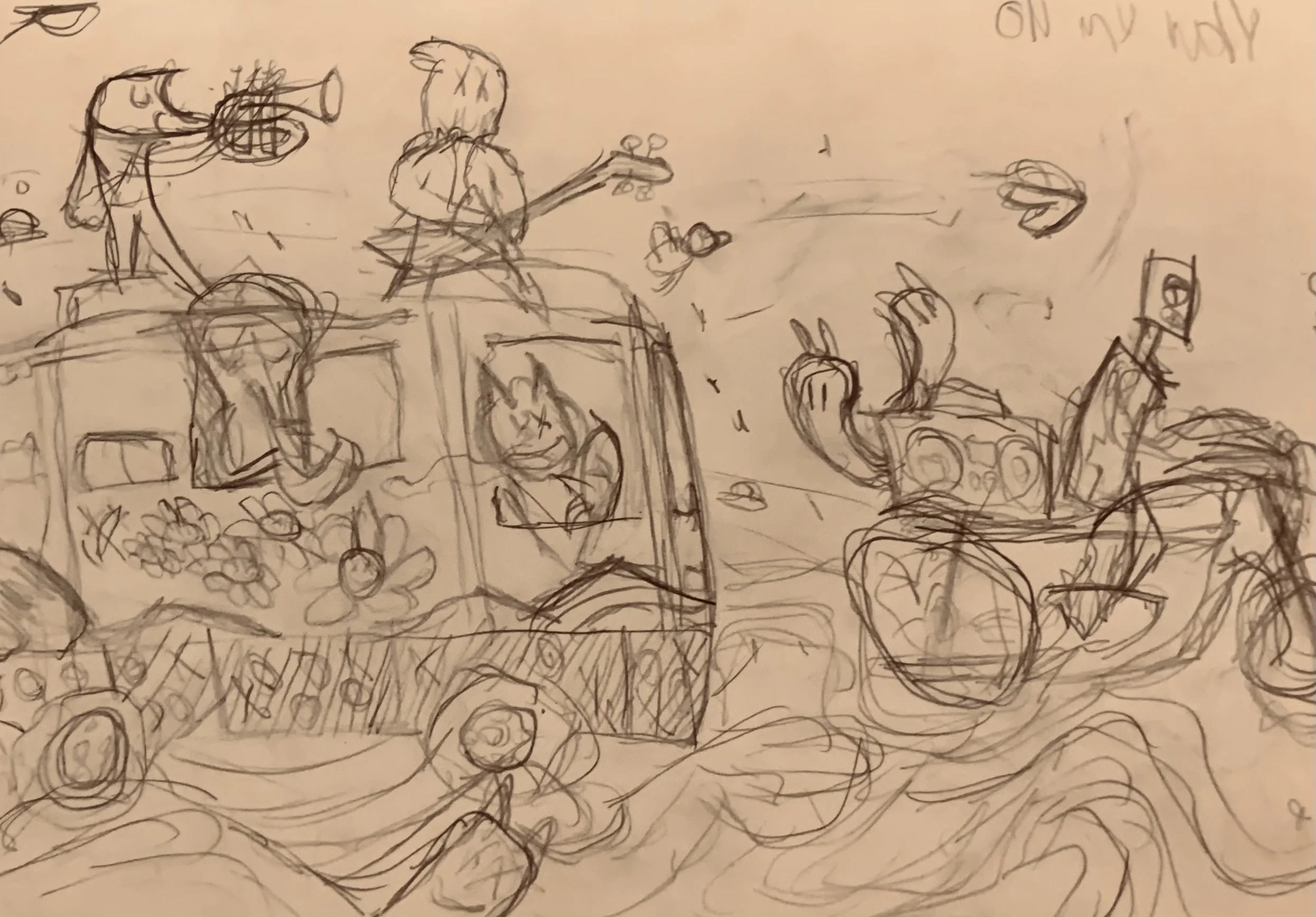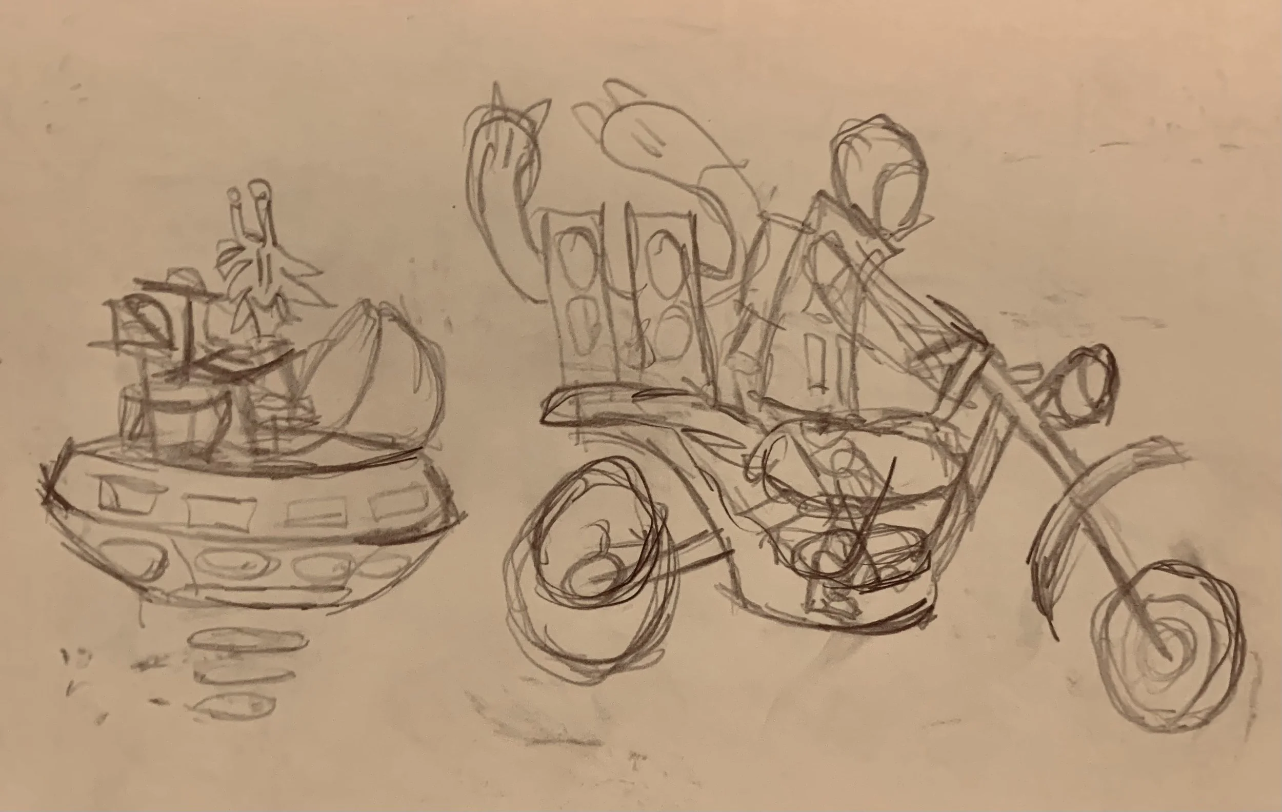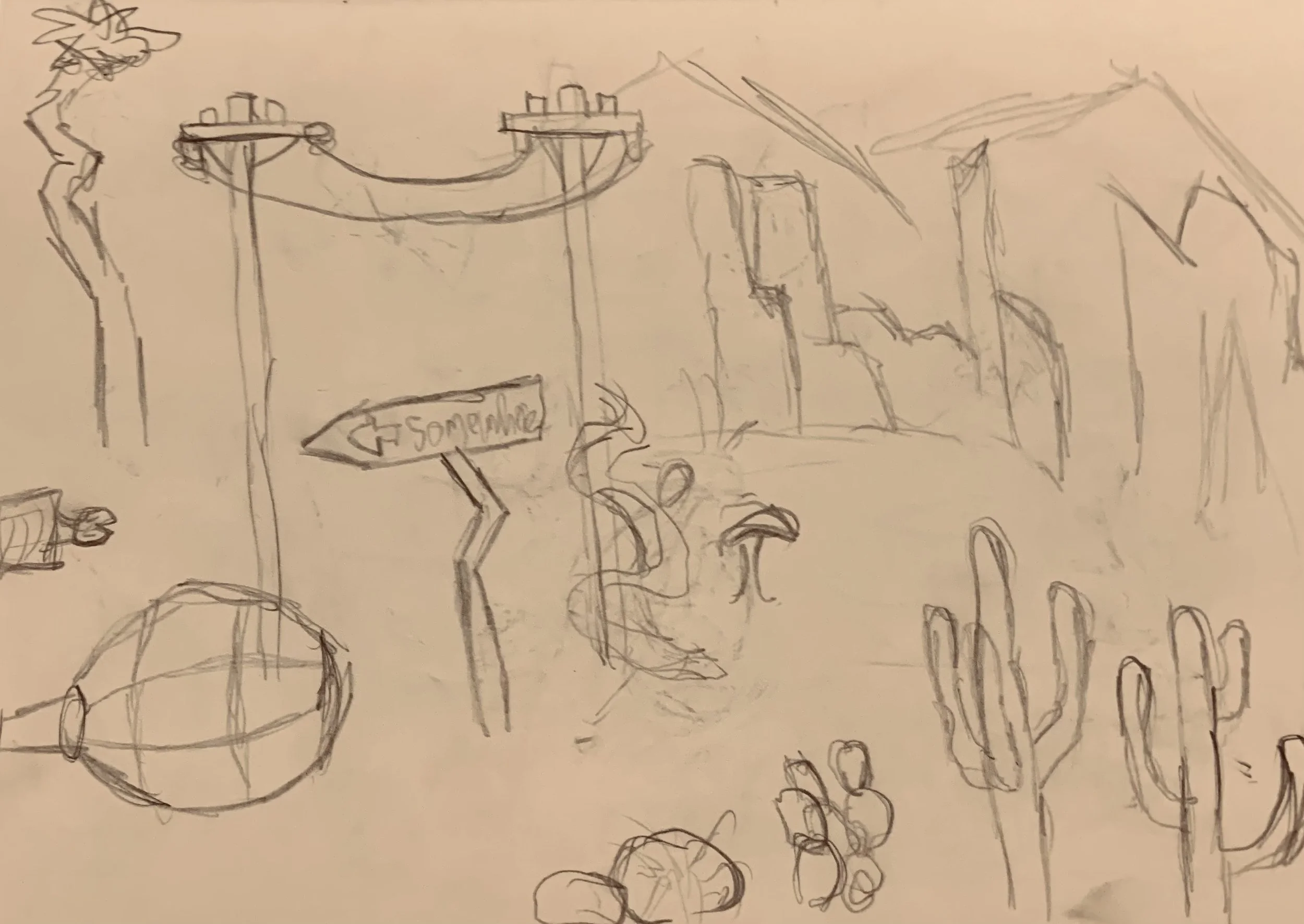 Sketches of different elements to add to the background. Like pizza being addicted by a spaceship.