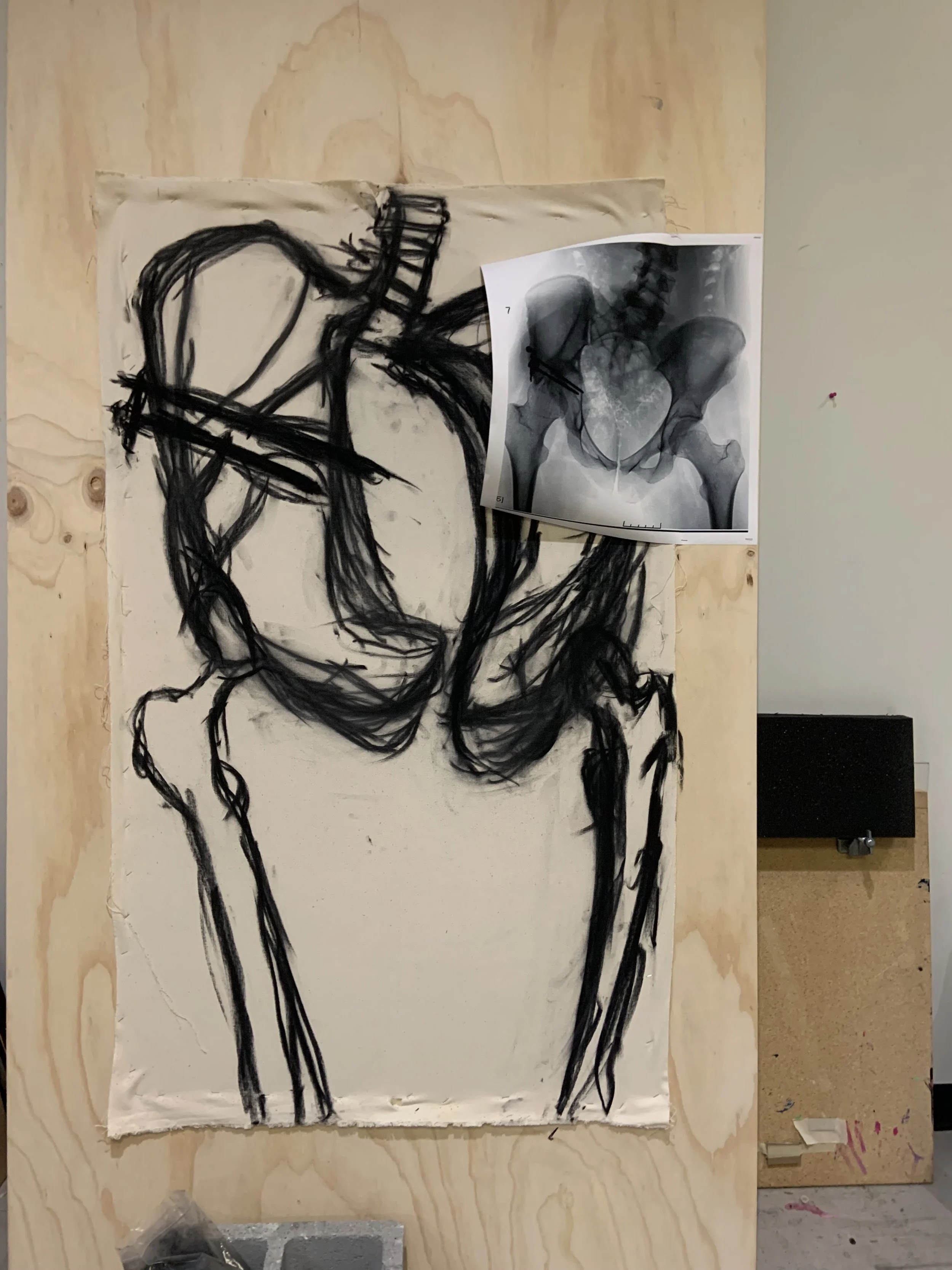 The color palette was inspired by road signs in my neighborhood. I captured photographs of these signs and meticulously color-matched them to create a cohesive design that resonates with the theme of walking. My relationship with walking is also expressed through three paintings created by physically walking on canvas with paint on my shoes. These pieces symbolize the journey and transformation I experienced, highlighted by the abstract representation of my broken hip bone. The outlines were skillfully drawn with charcoal, capturing the essence of movement and connection.